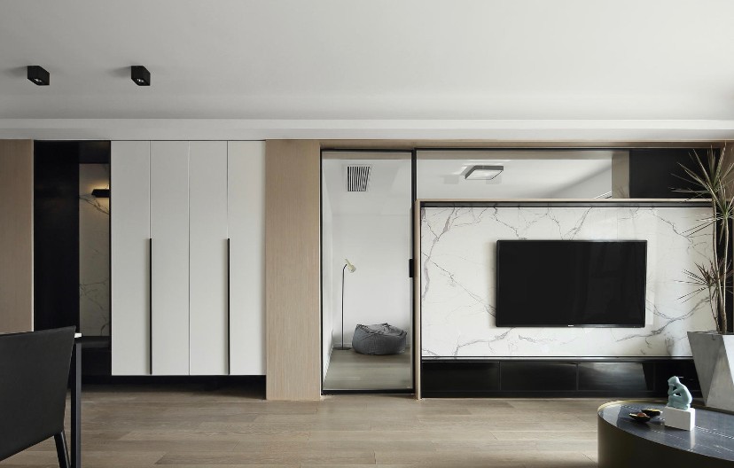 白墙衬着黑色皮质沙发有一点酷,卧室的隐形门藏在饰面板连绵的木色里,沙发这一侧的配色呈现在更大块面中,更显家的舒展姿态。
