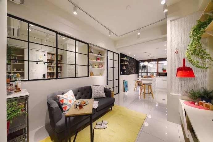 整个客厅的长度和宽度都不是很足,所以选择了简单的双人沙发搭配小边几的设计。侧面的隔板、小推车、花架等,也能为客厅带来一点储物空间。