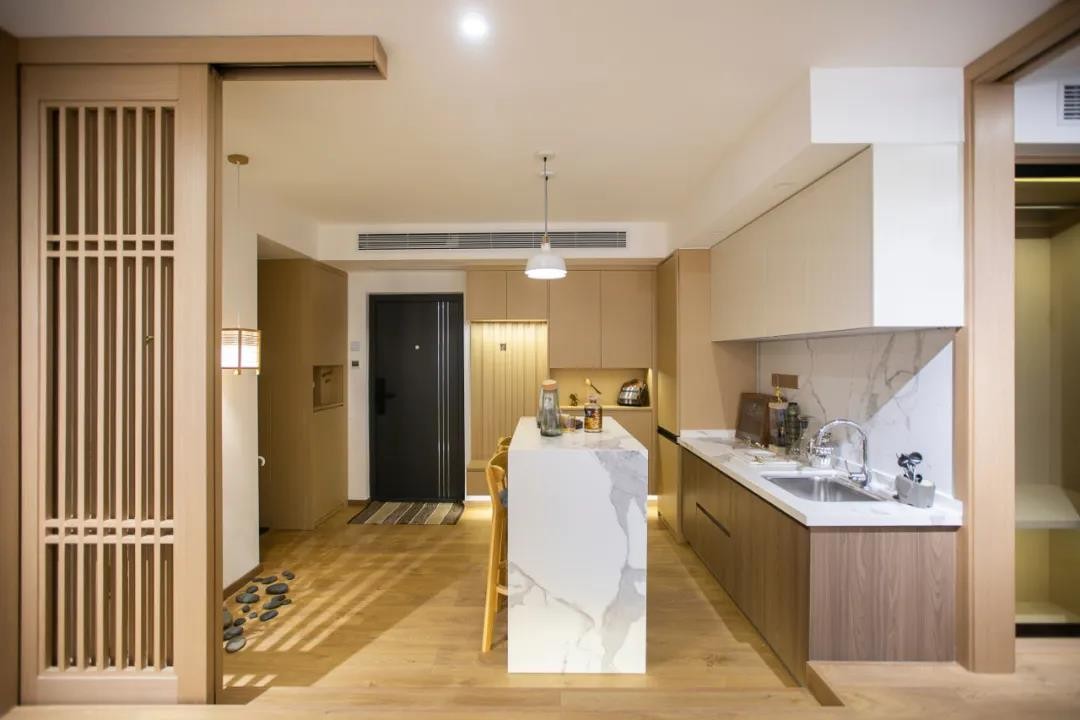 玄关进门后,在正对大门位置装一道木质屏风,布置竹枝与鹅卵石,顶上一盏吊灯,让回家空间充满情趣儒雅的端庄与气质。