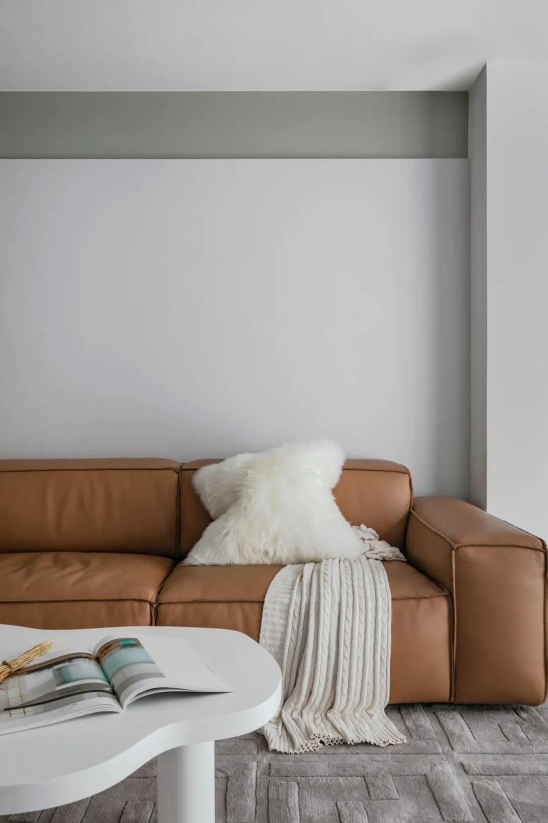 是来自于四口之家的紧凑型房型,由于面积有限,显得空间划分零碎,同时储物功能有待提升,西北边的两房依照客户需求处理成套房形;硬装以功能型提升,软装以舒适美观型选择。在整体风格上偏向折衷主义,没有完全固定统一的风格,在现代简约的基调上加入了种草元素,如豆绿的柜体、蜂蜜色沙发、浅粉及墨绿小方砖,力求营造一种自然静谧,更有温度的家居氛围。