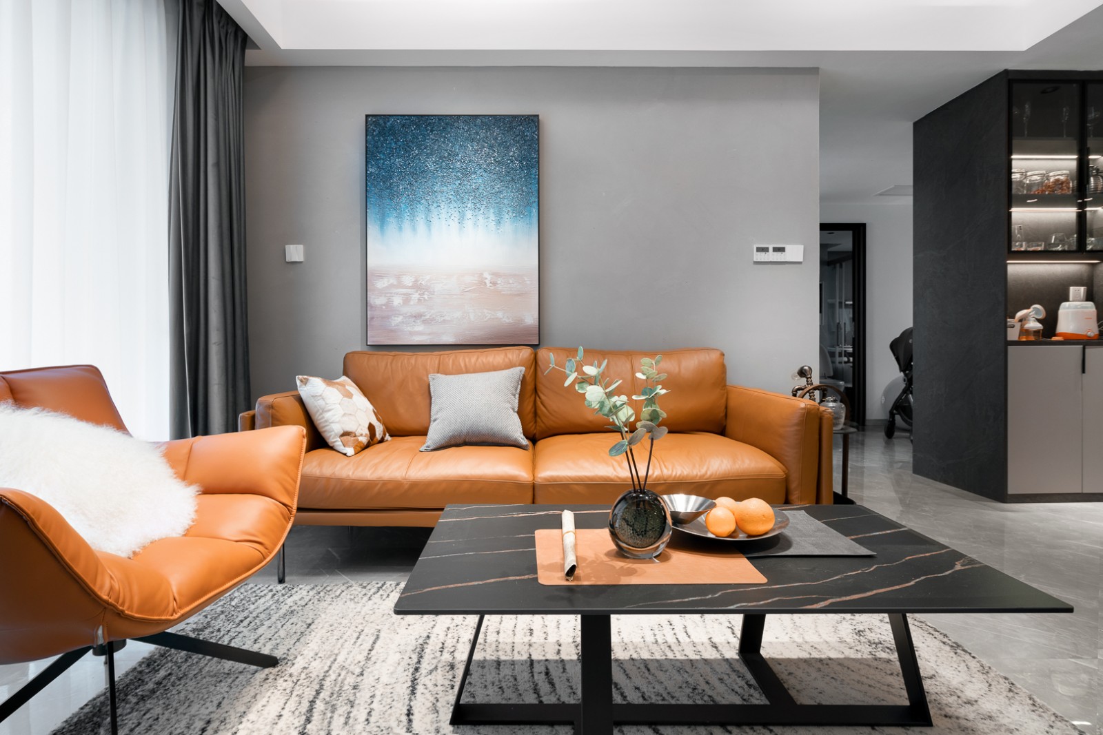 一组棕橘调的真皮沙发为主角,以一抹蓝调、少许绿意点缀其中,色彩、质感与层次在此碰撞、转换,造就客厅自然沉稳而不失高贵的气场。