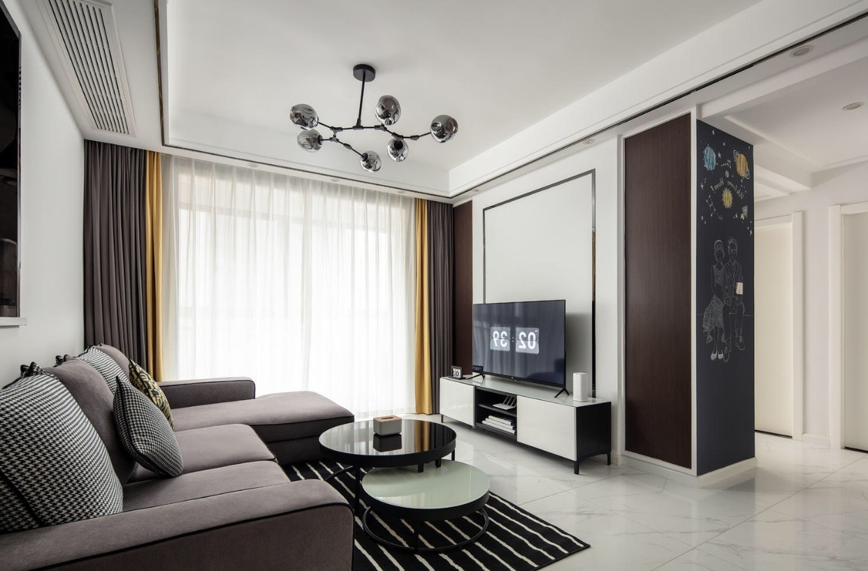 格局整体改动不大,只做了局部的调整,客厅采光比较好,但是餐厅面积也适中。黑白灰的整体,黄色系的点缀,是不是看起来也没那么高冷了?