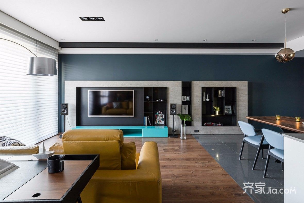 在整体空间上,用色上也是设计师的一大巧思,以沉稳的墙面与木地板为基调,再用高彩度、高对比的精品家具点缀
