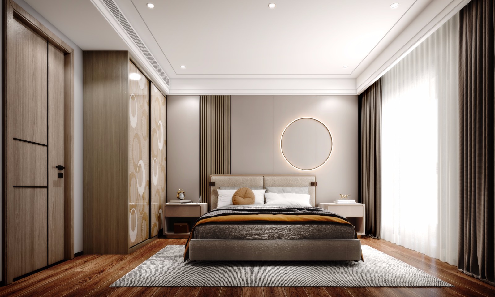 次卧,房间整体色调偏暖色调,给人一种既简洁又不乏温馨,背景墙采用软硬包结合,不生硬有质感,墙上的氛围灯即可装饰墙面,也可制造氛围