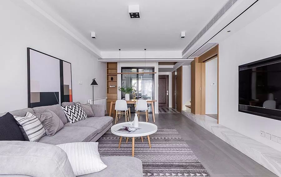 另外值得一提的是,暖白的空间里,设计师运用灰色的亚光砖、大理石电视墙台面,以及装饰画、抱枕等软件,创造层层递进的空间色系,为看似清淡的环境增添层次变化,是设计上的巧思。