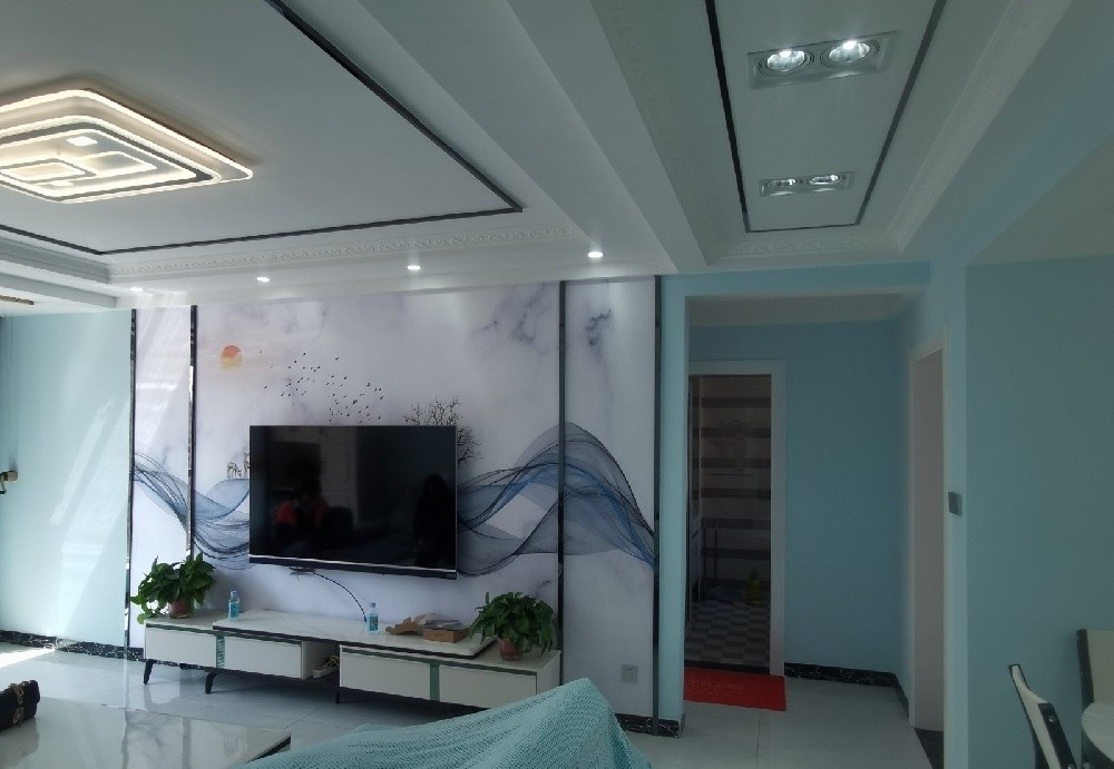 业主不喜欢大白墙,所以换了颜色,客厅用了蓝色墙面,更显清新,浅色背景墙,与墙面互相搭配,清新舒适