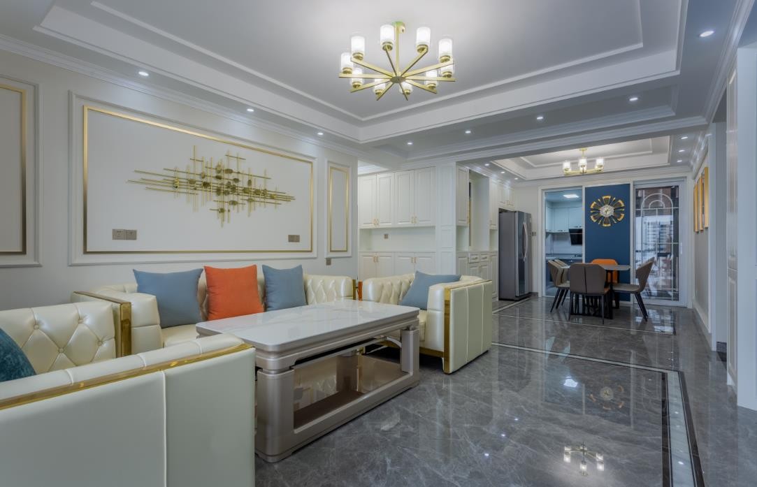 宽敞简洁的客厅布局,小巧轻盈的家具单品,灰白色的空间中加入蓝色为辅,点缀金属元素,丰富空间中和掉灰白色的单调,清爽干净的空间透露着精致轻奢感