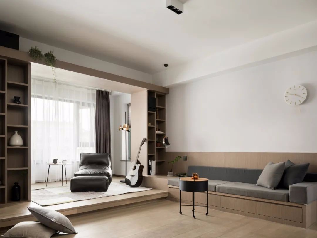 客厅打破常规,放弃电视墙,将沙发换成靠墙的坐榻,软装部分没有选择太大件的家具,小餐车取代茶几,可以灵活移动,进一步放大空间感。(不用担心坐榻坐着会不舒服,750的进深,10公分柔软的坐垫,和沙发是一样的做法。)