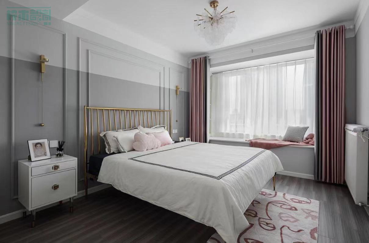 主卧采光好,床头背景墙分色处理不显单调,中灰色凸显了金色床头的质感,还有飘窗,可以随时享受一个人的时光。