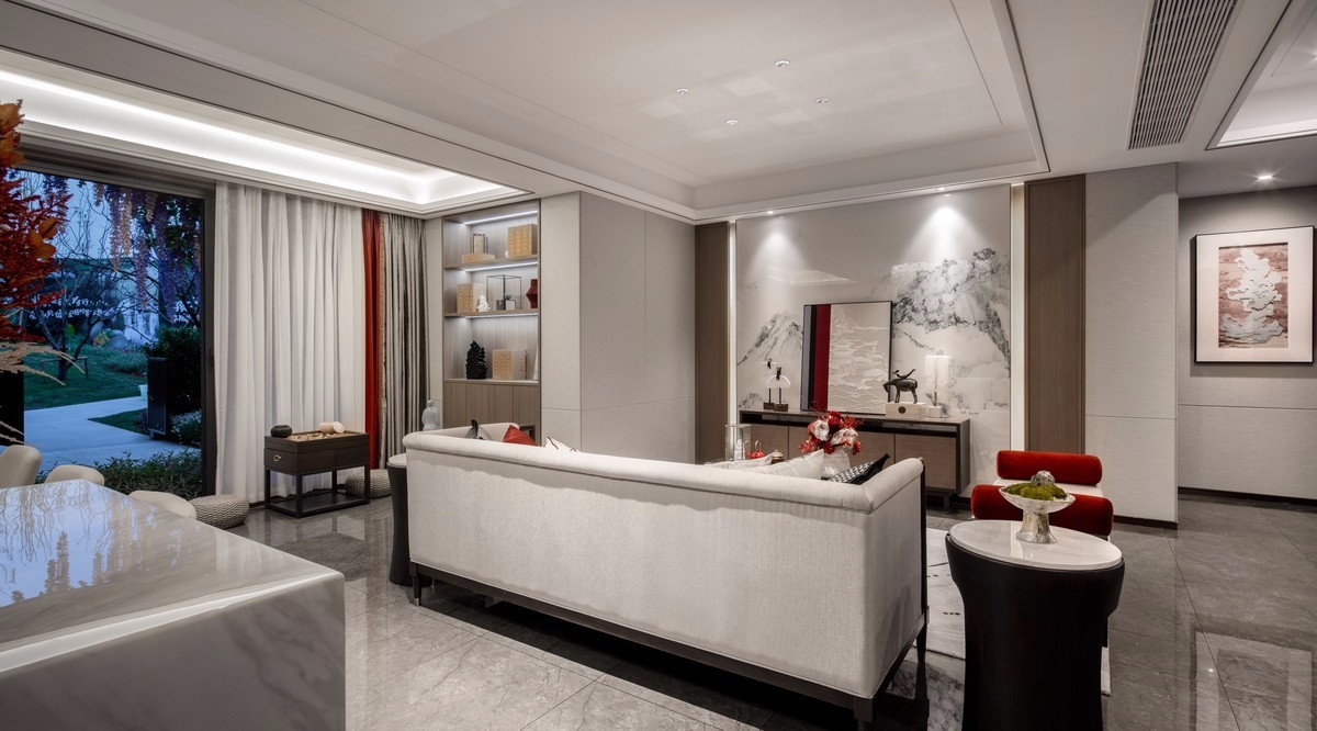 以沉稳大气的深木色作为硬装底色,配以实木、棉麻布艺、天然大理石,朱红色的陈设色调,空间元素紧扣当地潼南的地域文化,铺叙空间美学层次
