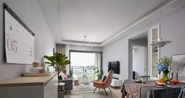 客餐厅一体开放式设计,通铺木地板让空间更宽敞明亮;墙面选择了淡雅的浅灰色做为背景,整体自然舒适,绿植、鲜花及粉色家具的点缀,增添了几分唯美浪漫的甜蜜感。