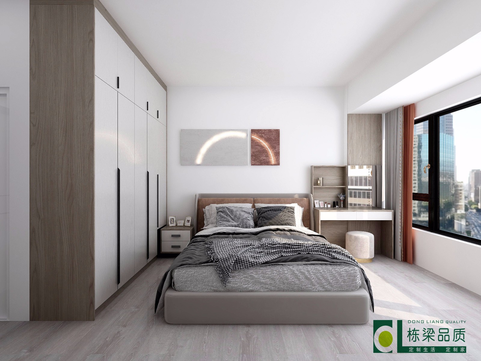 小孩房,主卧都是衣柜+床头柜一体,靠窗分别设计简约书桌/妆台。