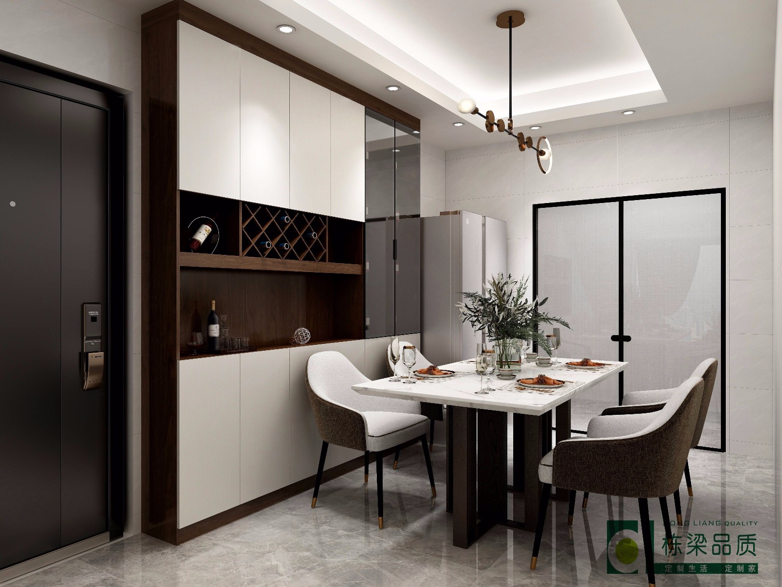 入门老左边设计酒柜,旁边摆放餐桌,多功能格局设计。
