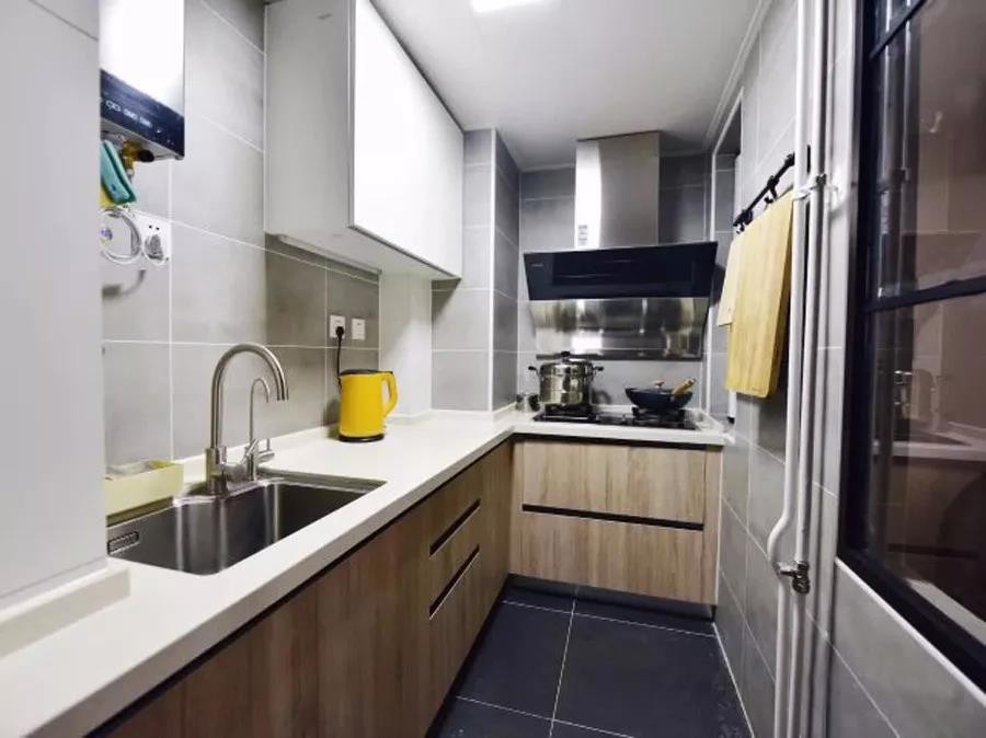 厨房是狭长的形状,所以选择L型橱柜的布局是最合适的,为了避免太过压抑,吊柜也只做了一部分,其他墙面可以用挂杆、置物架作为收纳。
