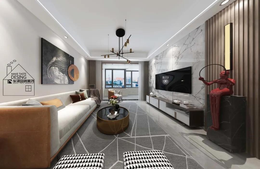 客厅色彩方面,设计师运用“莫兰迪色系”搭配,黑白灰,再撞色深色系列,如橙色、酒红,带来简明又轻快的视觉体验,也符合现代流行色彩的搭配。布艺沙发搭配舒服柔软的地毯,给忙碌工作后的你,留下一片放松、惬意的场地。电视背景墙采用的是大理石搭配,对面空间背景选择简单的挂画,将空间渲染出层次感,也体现了现代轻奢风格的简约低奢。