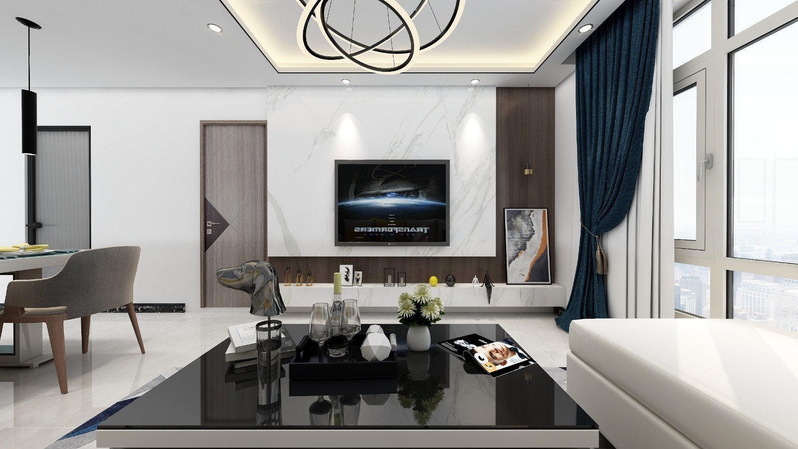 客厅靠着窗户采光很充足,电视背景墙用大理石做造型