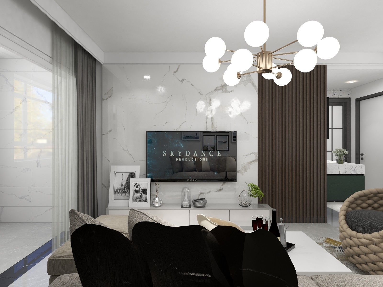 电视背景墙大理石和格栅的结合 使空间更加大气 格栅增加延伸感