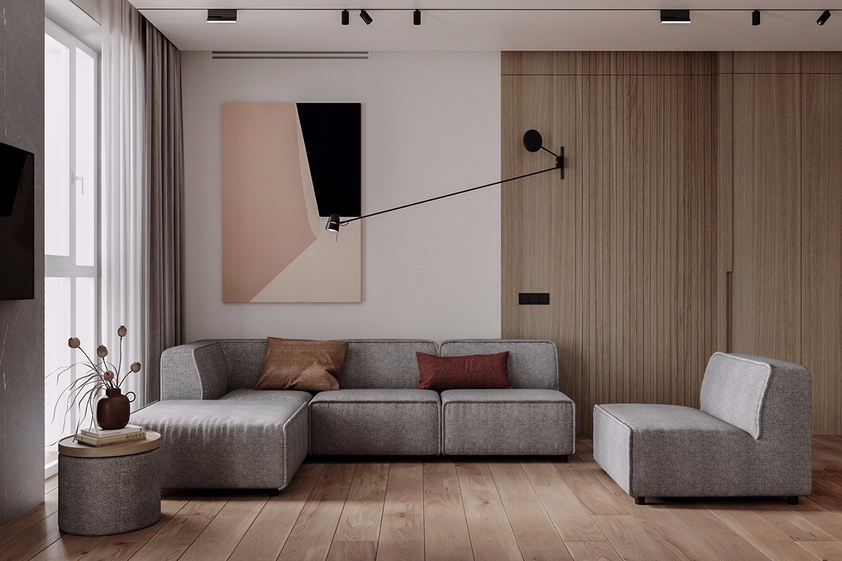 首先解决了背景暗门阻碍设计局限 同时关联到入门的玄关背景一体,在材质的选用是具有肌理感的木纹墙板和纯净的白色烤漆墙板,木纹的实与白色的虚两者交替融汇 伴随阳光的出现整个空间富有律动,留白的切割效果视觉上拉伸了背景 同时延伸了整体室内横向空间。