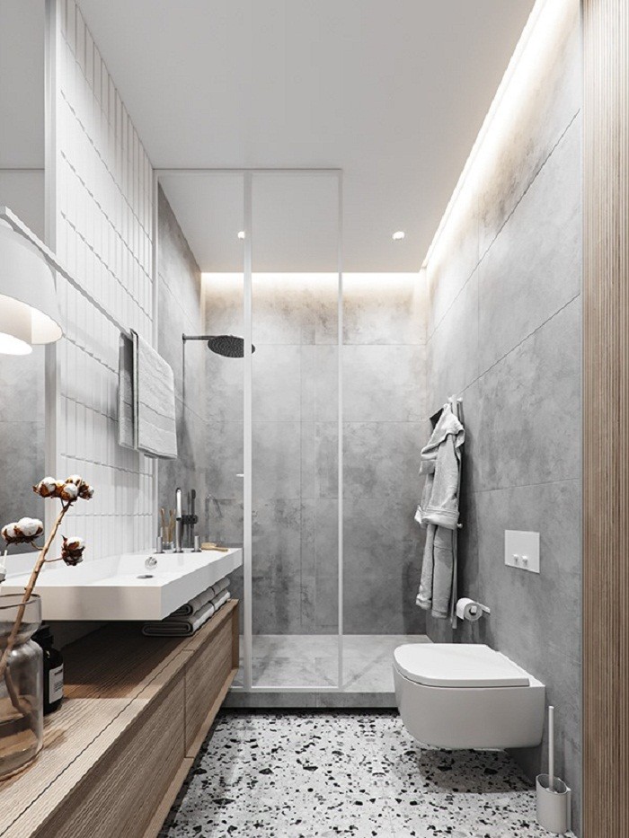 卫生间元素丰富且层次分明 地面铺设与玄关一样的黑白色水磨石 墙面使用素色混凝土饰面砖铺贴 天花边缘设转角隐藏光线 映衬周边细腻材质
