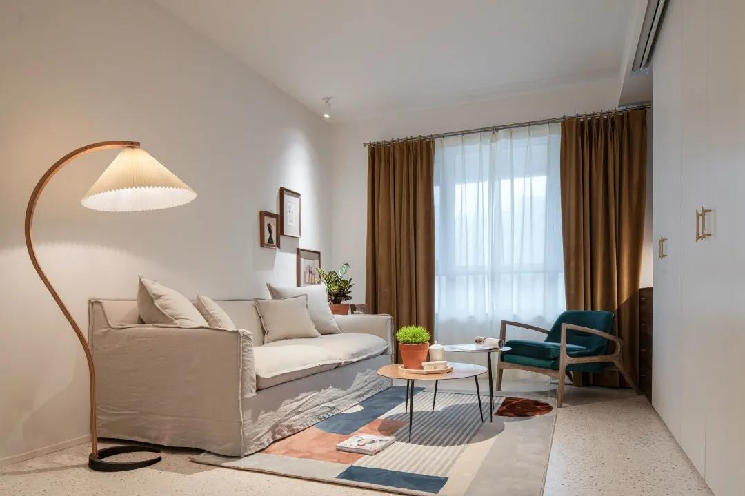 客厅一整面的收纳柜在靠近窗口处做了颜色和形式的调整,设置了四层抽屉+吊柜,更方便收纳小件物品和书籍。吊柜下部安装了感应灯带,傍晚时分照在松绿色的单人休闲椅和橙色的丝绒窗帘上,特别美。