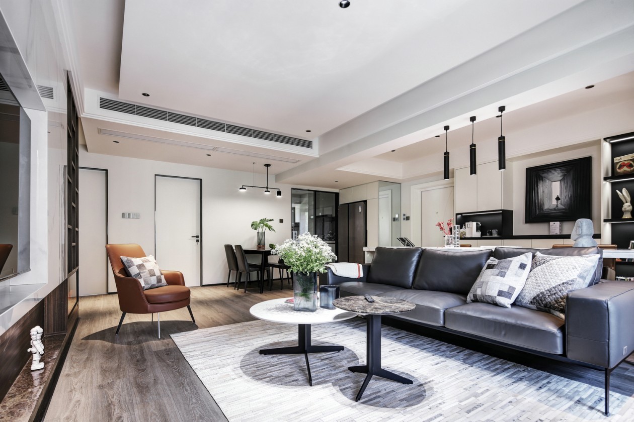 白色主色调搭配全屋浅灰色木地板,深灰色家具,黑白经典搭配,永不过时
