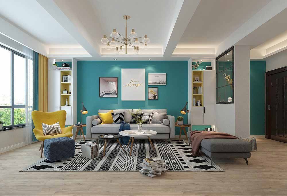 客厅比较独特,采用了比较大胆的蓝绿色做沙发背景墙,