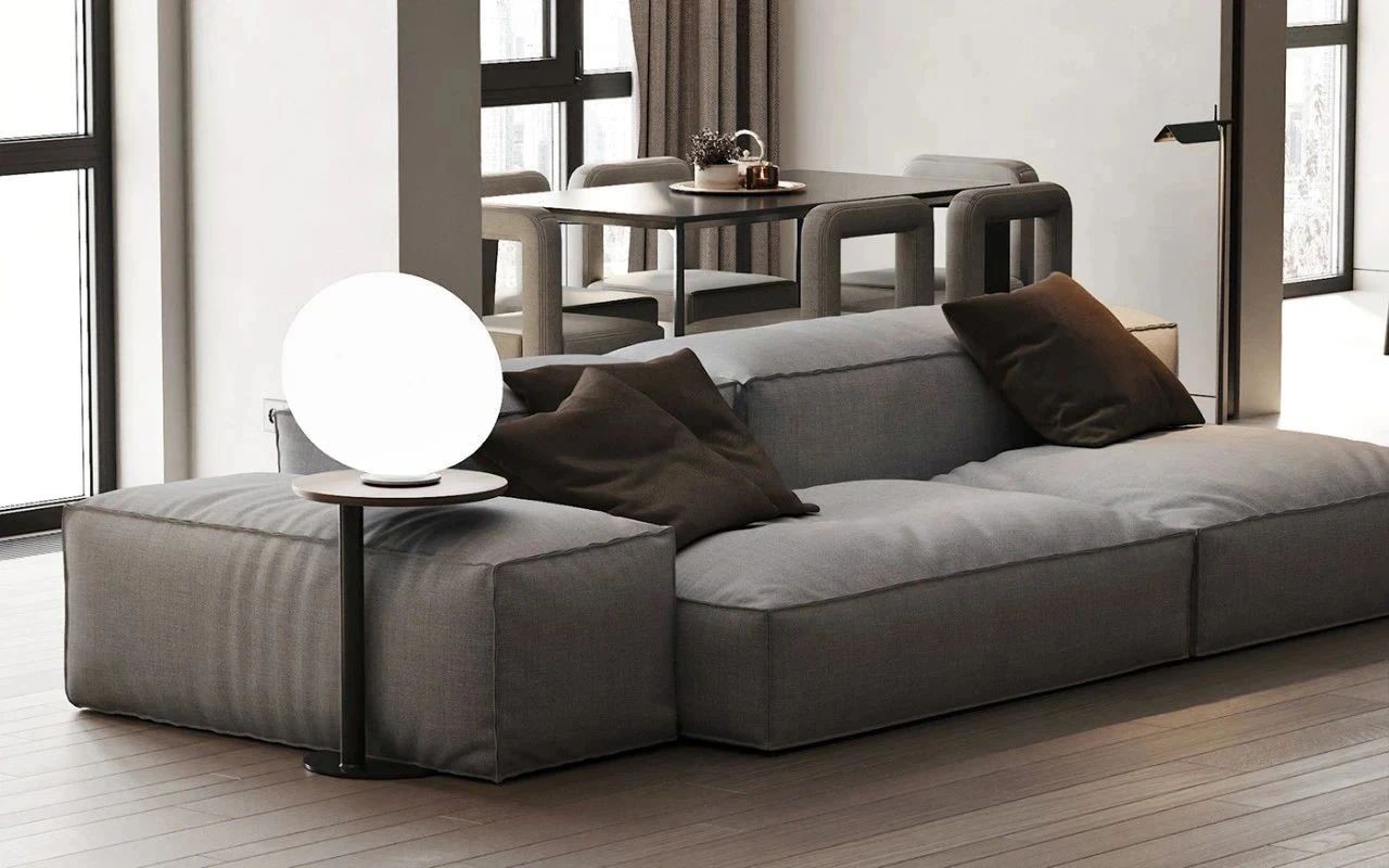 开放式的客厅带来明亮宽敞的空间,灰色布艺沙发与灰色大理石背景相得益彰,球型灯让这里颇有艺术气息。沙发后的餐桌紧靠窗边,带来***视角