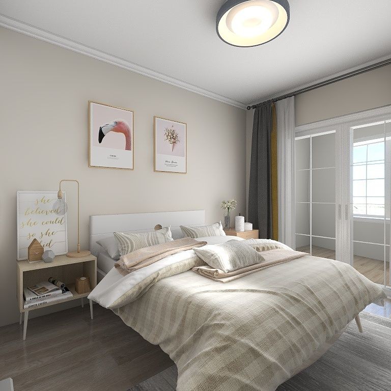 三段式的色彩点缀墙面,丰富视觉层次感。得益于玻璃封闭的大阳台,采光超棒!与大床同色系设计的大衣柜,实用温馨的空间布局,十分讨人喜欢,也透露出设计搭配功底