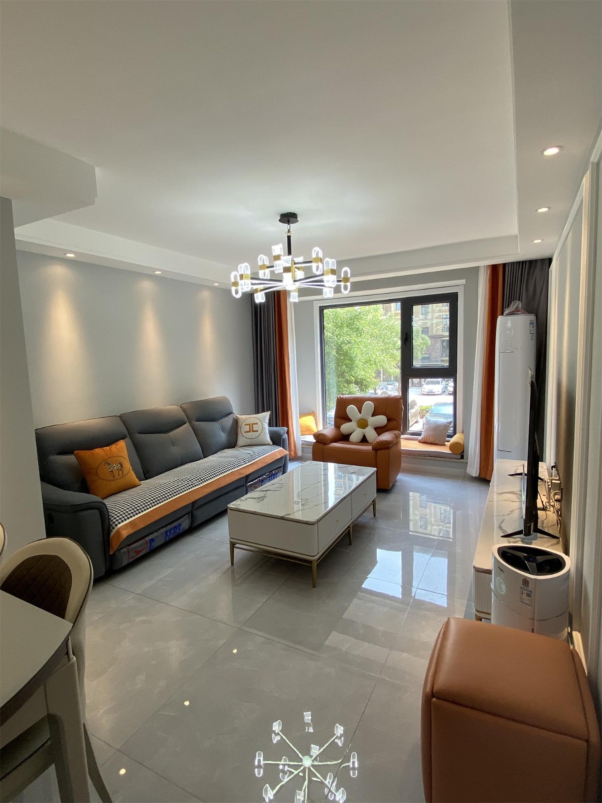 客厅位置采光甚好,设计师以淡灰色调为基调,沙发背景墙的灰色乳胶漆,与跳跃色橘黄色布艺沙发相呼应。平常光线穿透客厅畅通无阻,凸显雅致温馨的空间感。