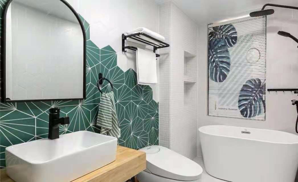 卫生间,极简的白色搭配精湛的绿色六角砖,灵动而别致。