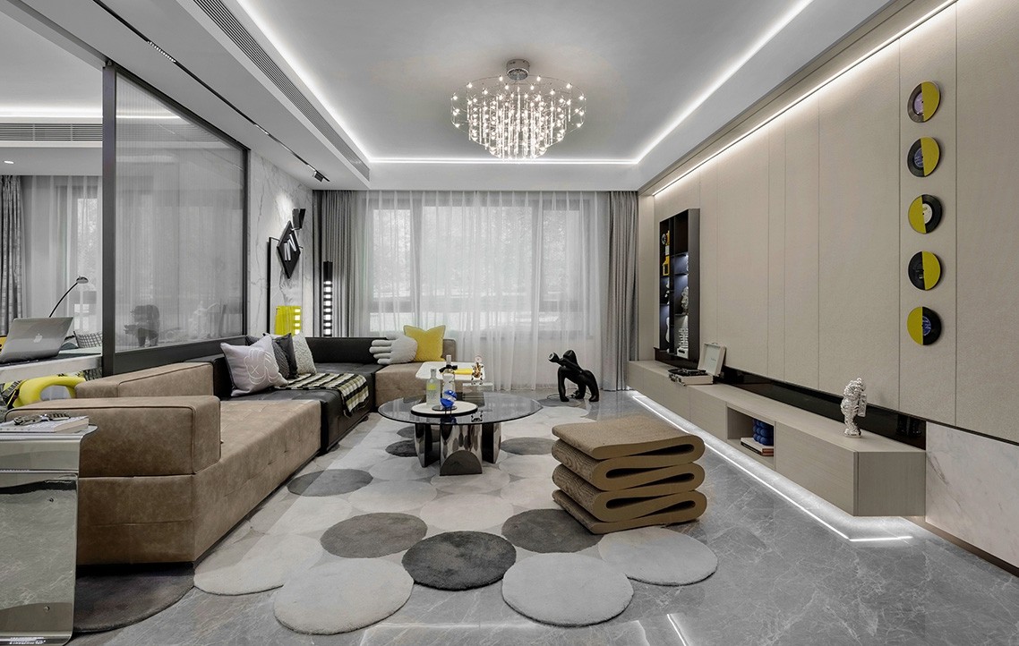 客厅以包容度高的黑色、浅灰与卡其为基底,局部妆点个性亮黄和宝石蓝,联手表达出坚韧乐观的正向态度。