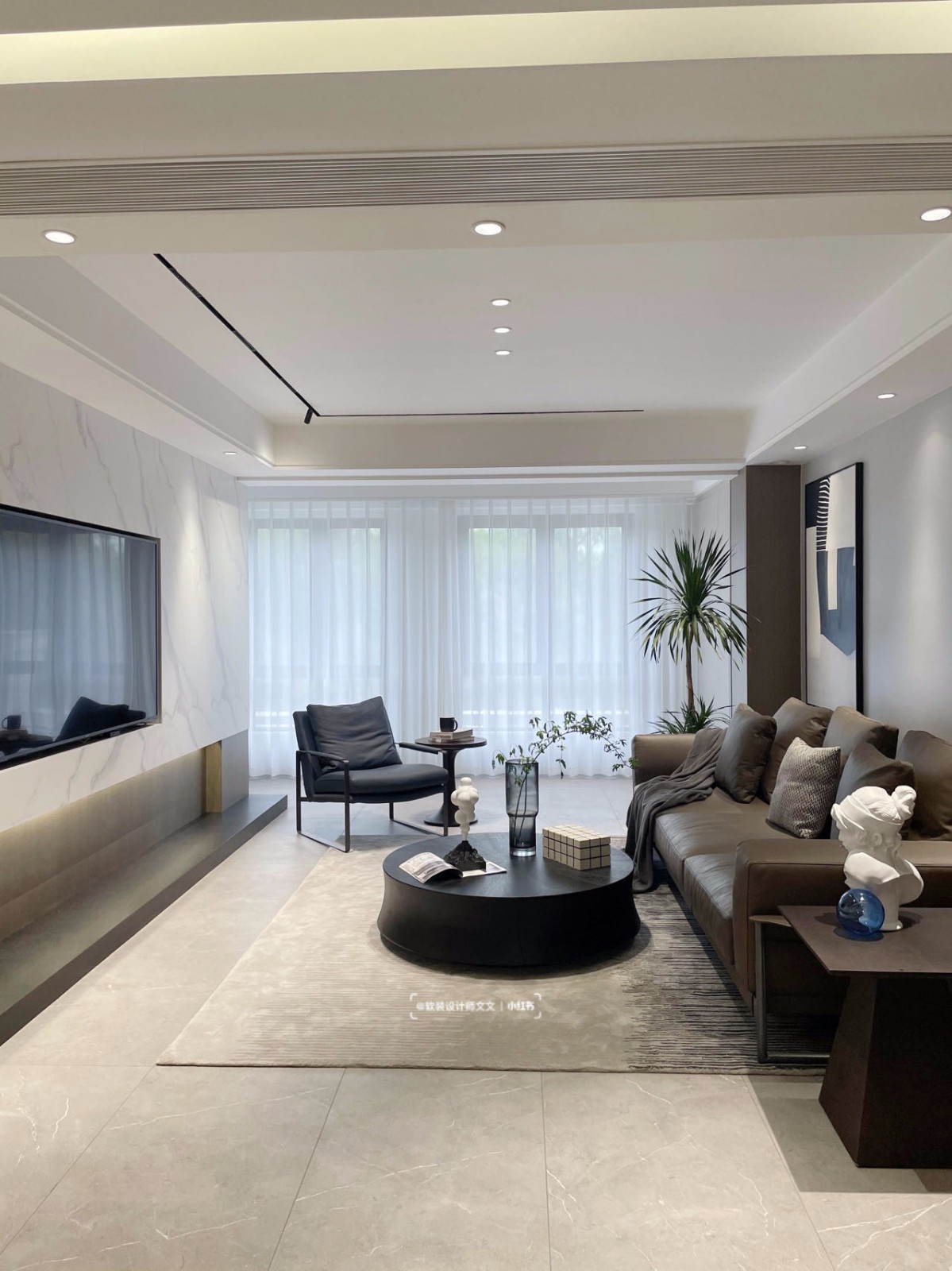 电视背景用大板,摈弃了传统的电视柜采用地台,吊顶天花用无主灯设计