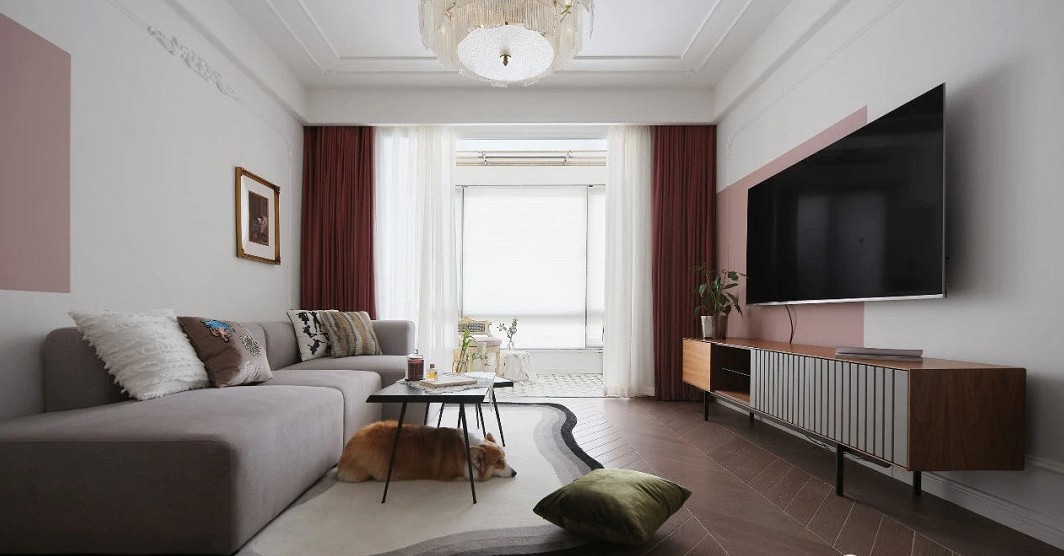 客厅空间以白色为主色调,在视觉感知上,白色是比较柔和、干净的色调,搭配上粉色的撞色,带来别具一格的温柔与优雅,使空间调性在和谐统一的基础上更加具有层次感。