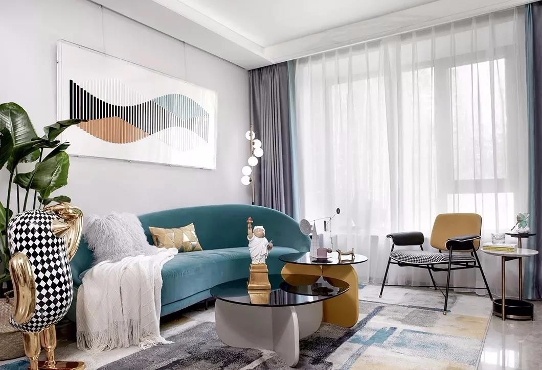 客厅整体空间以现代风的硬装基础,布置上色彩丰富的艺术感软装家具,带来的空间感充满着文艺与优雅的气质。