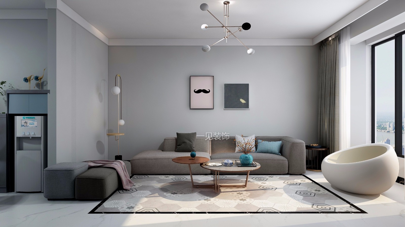 整个空间以浅灰色调为主,局部跳色做点缀,大气又不失温馨