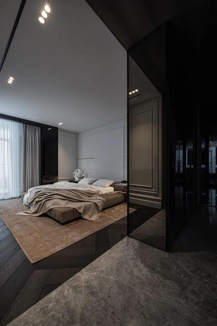 卧室和客卧采用略显禁欲的风格制造,没有东西会影响房主或客人睡个好觉。为了增加深色空间,工作室选择了带有滑动隔板的精美石墨玻璃作为衣柜。