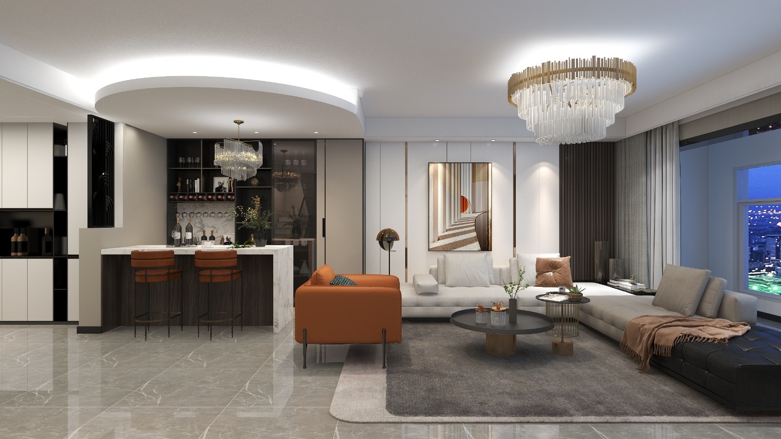 业主一家三口,对餐桌的需求不大,整体以米咖白为主,爱马仕橙调节房间色度,加金色线条,有点偏轻奢效果