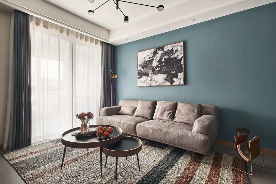 地砖,地毯,沙发,墙面灰蓝的***块错落有致