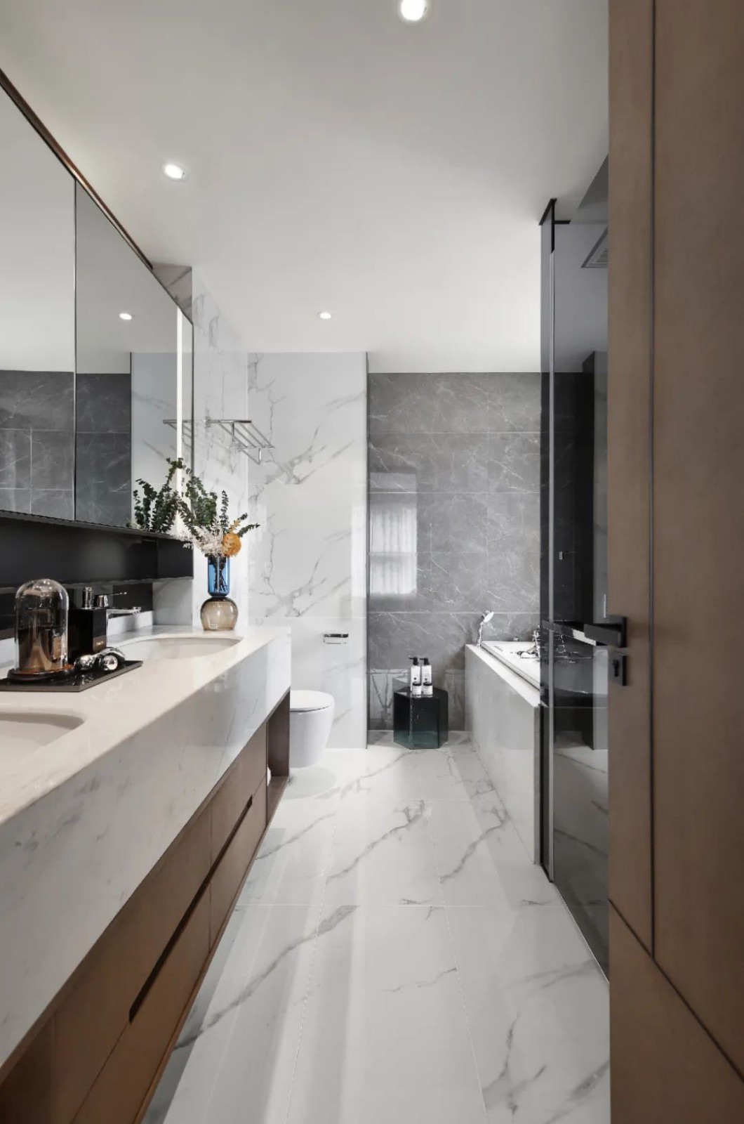 木色与米灰是极富淡雅气质的色彩,立面与地板大面积米灰色铺陈,构建意式风的基调。细节中注入纹理与几何元素提升整体品味,再现经典视幻艺术,达到梦幻又现实的意境效果。