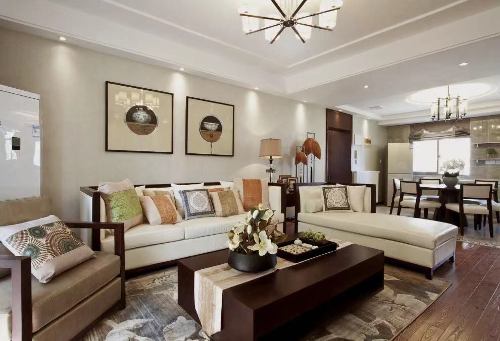 户型色彩上以米白为主色调,配已具有中式传统色彩穿插角落