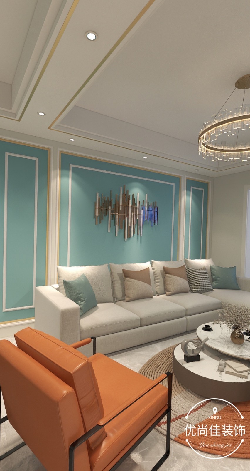 客厅沙发背景墙装修效果;以简单而又明快的线条,配上金属的装饰。