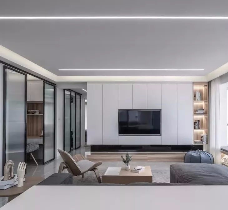 内嵌的电视背景墙很有现代时尚感,整体软装布局充分展现现代美学。