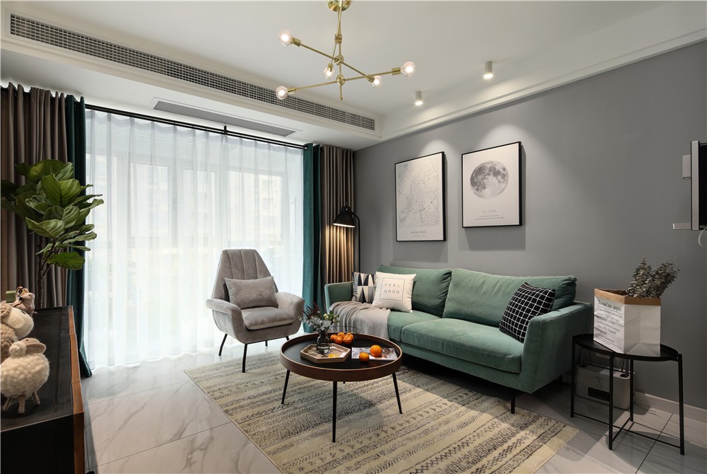 大量的灰色墙面安静的陪衬着墨绿色的沙发,灰色的窗帘布搭配着墨绿色的丝绸布