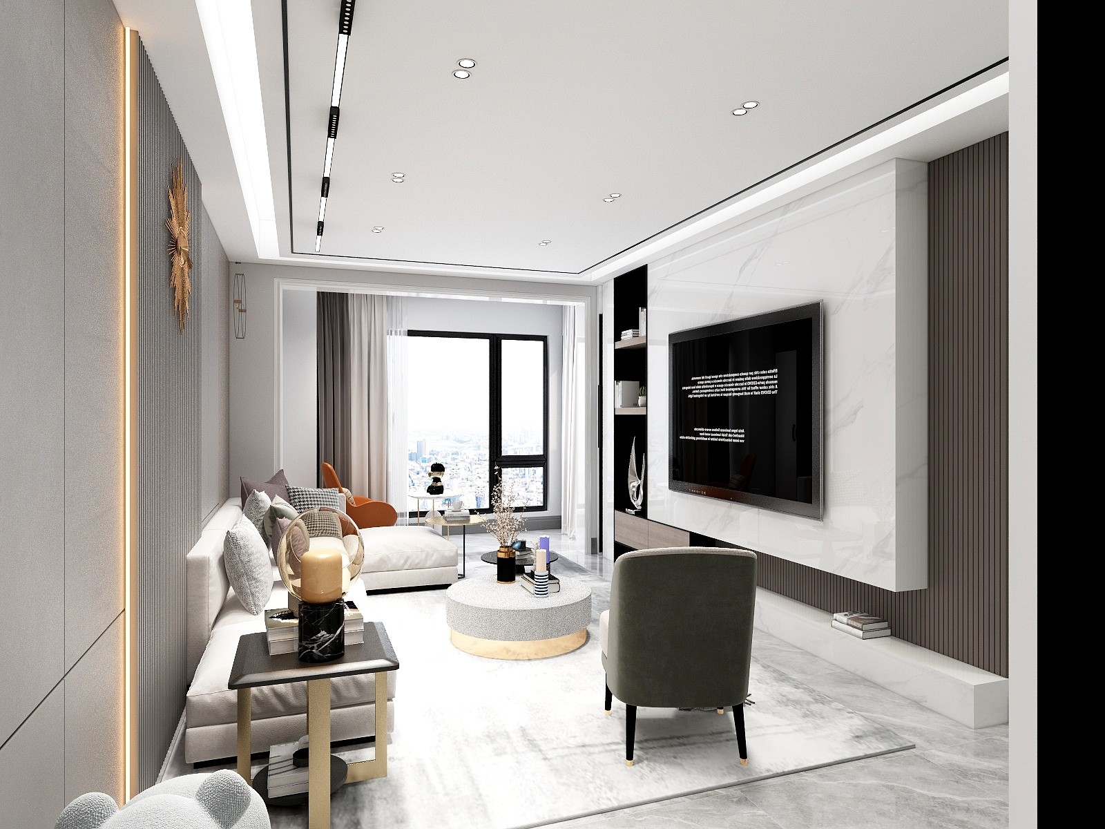 电视墙以定制柜为设计,左侧布置一个端景台,右侧是阳台玻璃门,中间实用的定制电视柜还加入了开放格的设计,整体显得实用而简约精致。