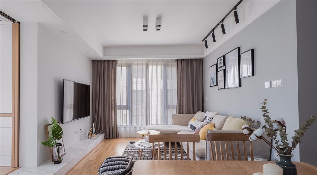 简约带有北欧气息,以白色加实木色为主色调,紧凑型小三房。