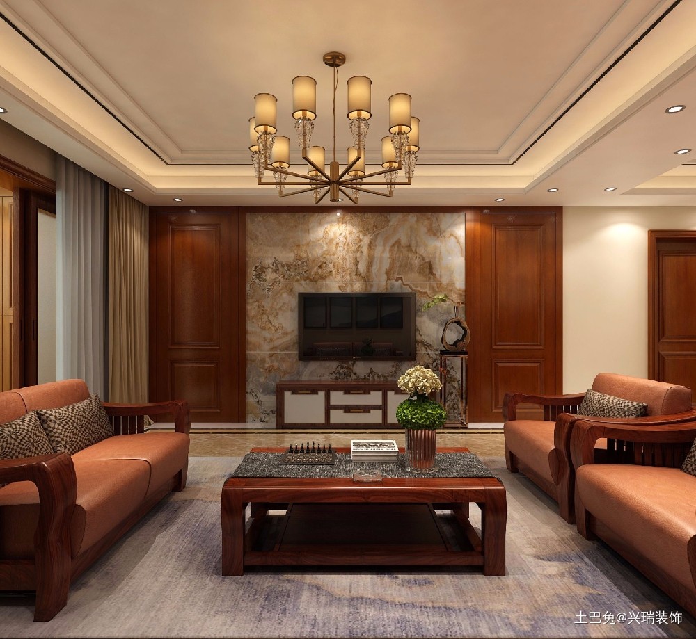 客厅吊顶加吊顶,电视背景墙采用对称护墙板加大理石设计,软式家具采用中式点缀。