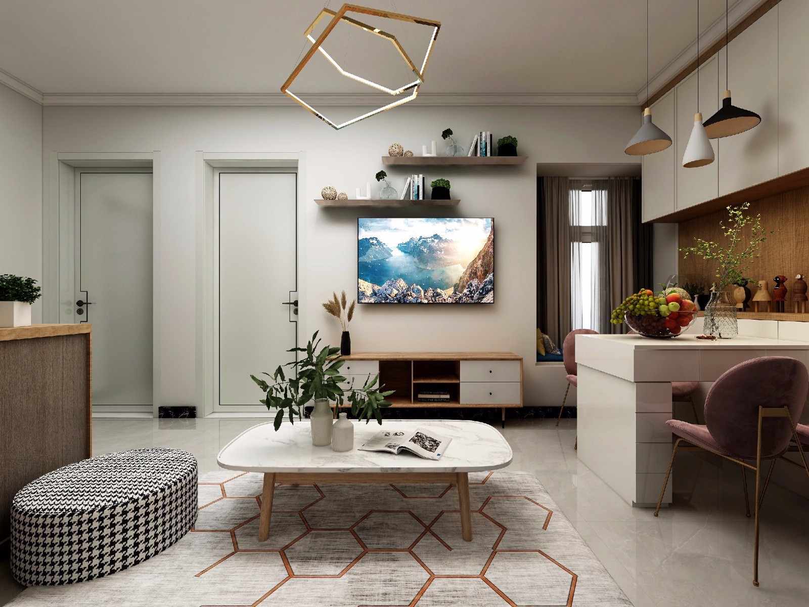 考虑到空间舒适性,我们将电视背景墙向主卧方向移动,以扩大公区活动空间。基于收纳需求的考量,电视背景墙以柜体的形式呈现,强大的收纳力征服全场