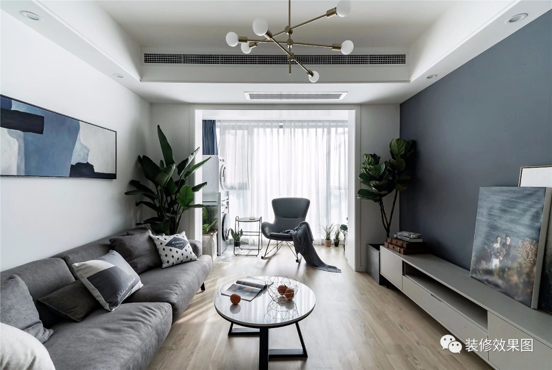 客厅以灰色和白色为主调,营造简约而沉稳的空间氛围。灰色布艺沙发柔软而舒适,小小的茶几线条简约,灵活又实用。