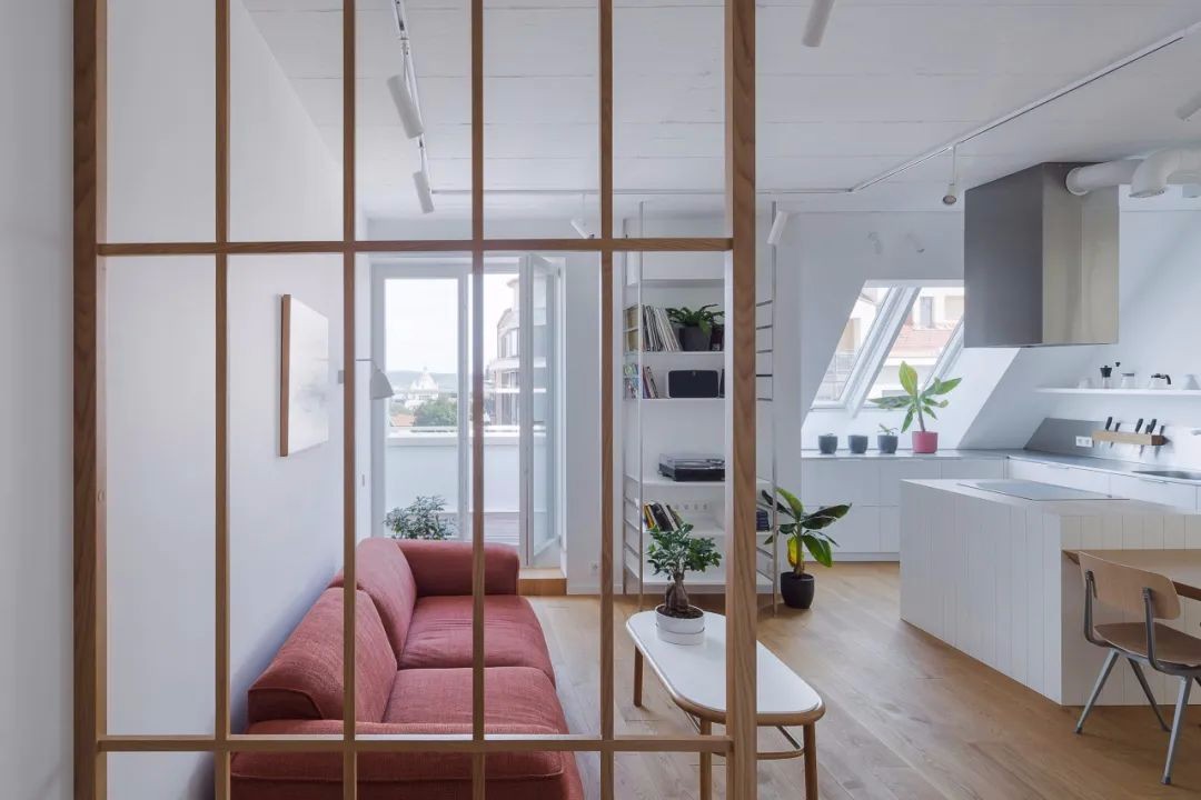 玄关和客厅之间用竖立木格栅柔性分隔,营造虚实框景,同时保证视线和采光的流动。