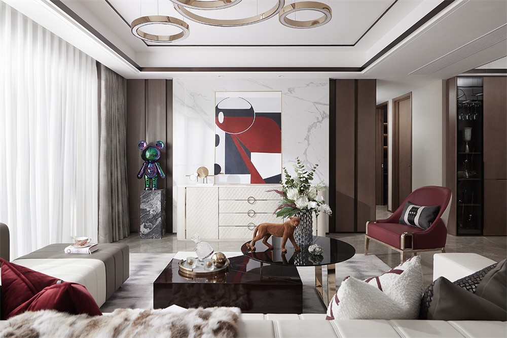 以金属勾勒出多层次的展架,描摹出都市生活中的轻奢质感。几何形式的边桌,诉诸方圆的造型,简约大气。男主人把玩的开瓶器、雪茄剪被封装成画面,桌上的希望鸟雕塑玩偶也在致敬来宾。